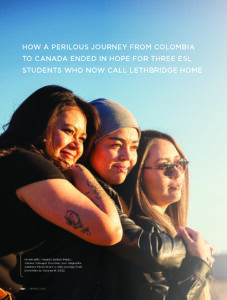 As Lisa Kozleski describes in the story, the image depicts Alejandra Jiménez Pérez, Johana Sabogal González and Mauren Gaitán Pérez. “They had spent years in their home country of Colombia organizing meetings, protests and workshops supporting the LGBTQ+ community and causes. But now that work had provoked credible death threats from the “Black Eagles,” a paramilitary group that was known for targeting social leaders….So they left…. The journey they faced was risky – at one point they were literally lost in a desert – but with a cousin waiting in Lethbridge, the three eventually made their way to Canada.”